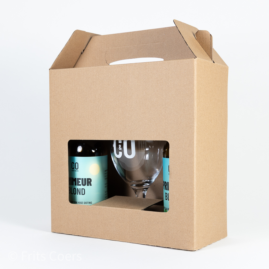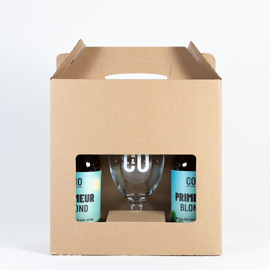Deze cadeauverpakking bevat 2 flesjes Kringdagenbier en een uniek CO&CO bierglas!